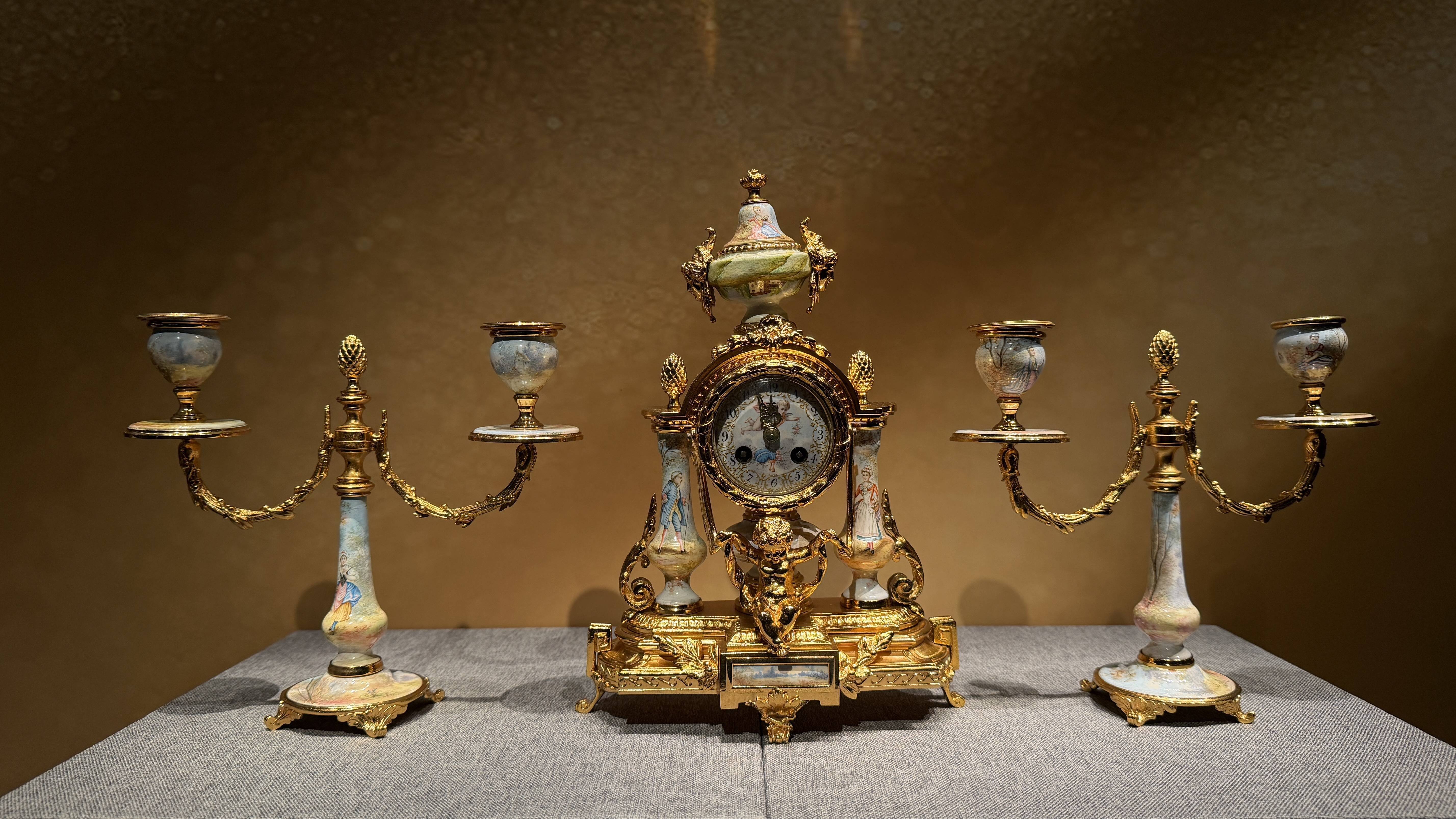 铜镀金搪瓷东谈主物雕琢三件套壁炉钟。(大连博物馆供图)展览中,19世纪法国制造的铜镀金搪瓷东谈主物雕琢三件套壁炉钟诱惑广博不雅众驻足。“壁炉钟是那时欧洲家庭居室中极具代表性的计时成列,常置于客厅或卧室的壁炉架中央。”姜晔说,壁炉钟以主钟居中,两侧配有烛台或湮灭瓶,组成和洽调治的三件套组合,既是实用计时器,亦然室内艺术的难题组成部分。